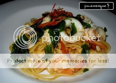 kaizhi had the spaghetti with seafood in thai basil and chilli sauce (320 baht)...